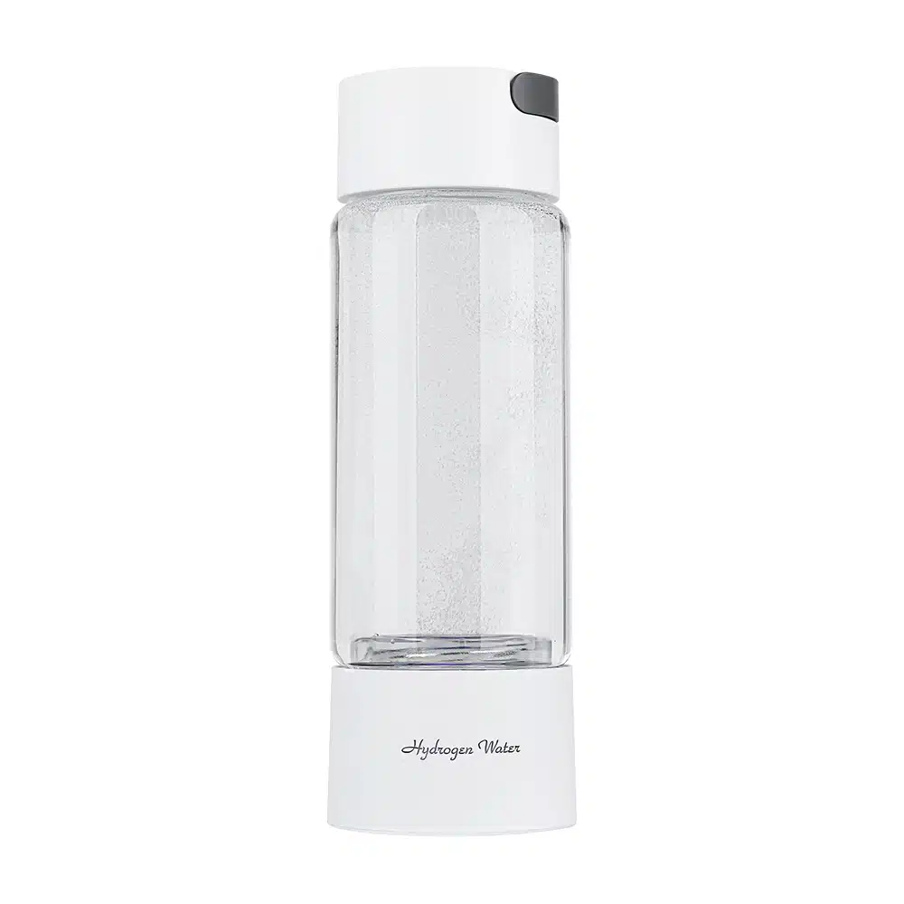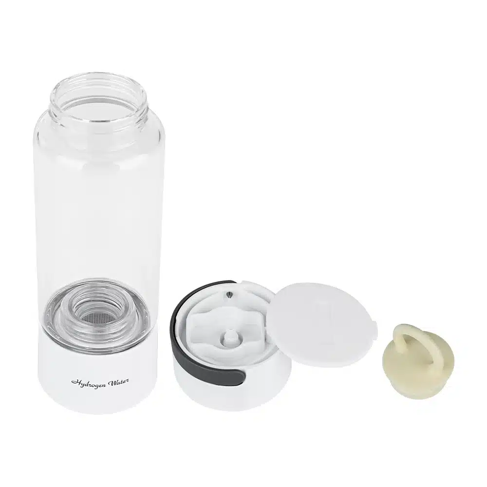 A garrafa utiliza uma membrana PEM e eletrólito sólido (SPE), que separa o hidrogênio da molécula de água e o dissolve novamente, produzindo água rica em H₂ em poucos minutos.